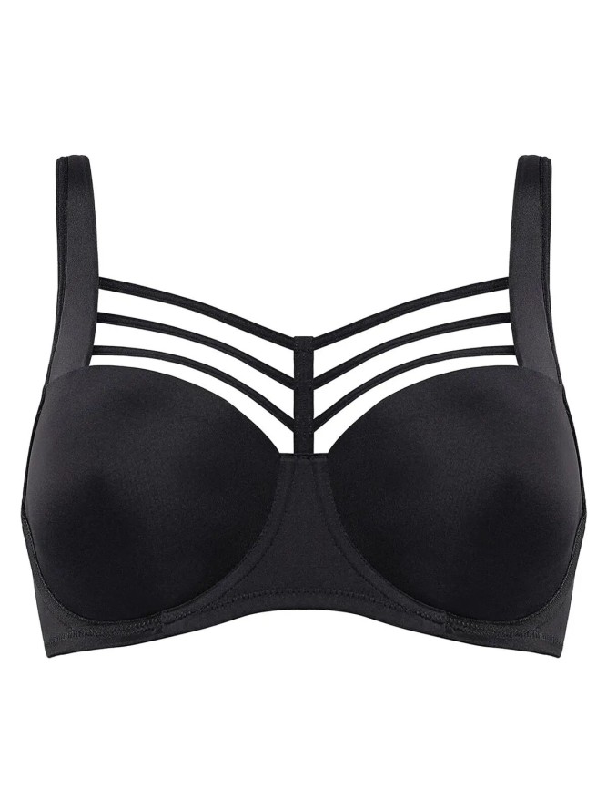 Gustowny damski biustonosz. Model na fiszbinach typu balkonetka mocno zabudowany z wysokim mostkiem z dwoma cięciami, który w pełni zakrywa biust. Ciekawym elementem, który przykuwa wzrok są paseczki w górnej części nadające uroczego i...
