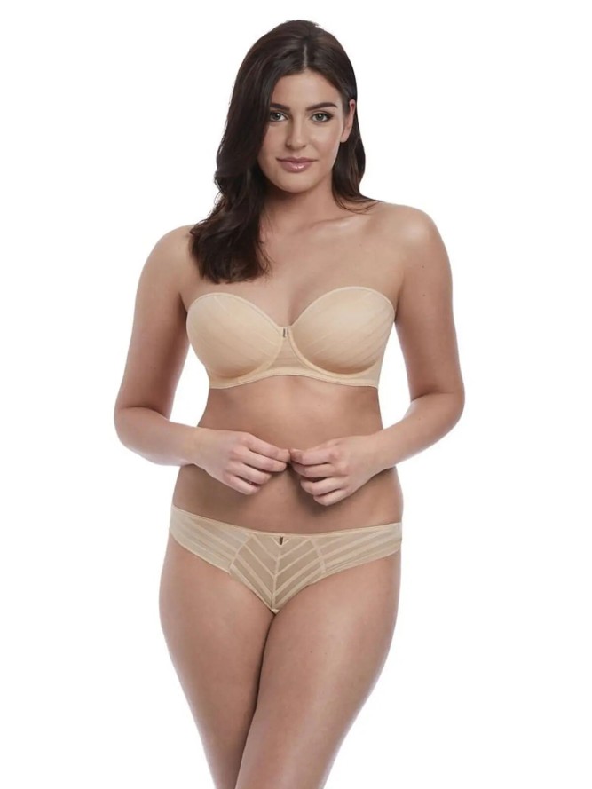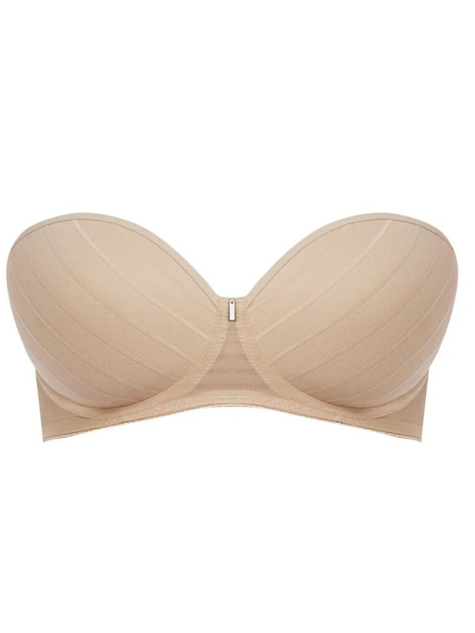 Freya Cameo, to usztywniany biustonosz damski w stylu bardotki. Osadzone na fiszbinach, płytsze w konstrukcji kroju miski, dzięki wyprofilowanej gąbce, doskonale unoszą biust, tworząc efektowny i seksowny dekolt. Wykonany z jednolitej, lekko prążkowanej tkaniny przód, nadaje modelowi oryginalności. Istotnym atutem tego biustonosza, jest szersza konstrukcja, zapinanego na haftki, gładkiego, pokrytego silikonową taśmą obwodu, która gwarantuje lepsze dopasowanie i stabilizację modelu. Regulowane ramiączka z możliwością całkowitego odpięcia, czyni produkt niezwykle praktycznym dodatkiem, we wszystkich odsłaniających ramiona stylizacjach.