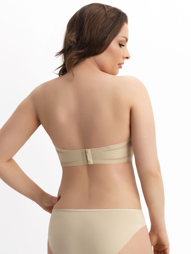 Praktyczny biustonosz typu bardotka. Model gładki na fiszbinach z odpinanymi ramiączkami, które można przepinać na różne sposoby. Idealnie się sprawdzi pod różne wymagające stylizację. Zapinany na haftki, by swobodnie regulować obwód do swoich...