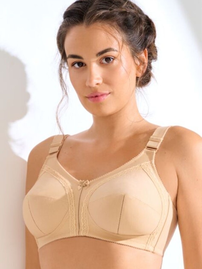 Ramiączka tego biustonosza są regulowane, co pozwala na idealne dopasowanie do sylwetki, a miękkie miseczki zapewniają naturalne podtrzymanie biustu, jednocześnie eksponując jego naturalny kształt. Model ten należy do kategorii biustonoszy bez fiszbin, co czyni go idealnym wyborem dla pań preferujących naturalne podtrzymanie. Beżowy kolor dodaje stylu i elegancji, jest także łatwy do dopasowania do różnych elementów garderoby.