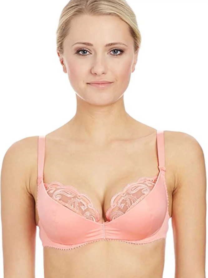 Niesamowicie uwodzicielski i oryginalnie zrobiony biustonosz od firmy Maison Lejaby. Model wykonano z delikatnych oraz przyjemnych dla ciała tkanin. Przód biustonosza składa się z dwóch nachodzących na siebie warstw materiału: spodniej (delikatnie prześwitującej, elastycznej koronki) oraz wierzchniej (lekko usztywnianego, gładkiego materiału). Charakterystyczne drapowanie materiału pomiędzy biżuteryjną ozdobą oraz u nasady regulowanych ramiączek, nadają modelowi oryginalny look. Dzięki cięciom modelowym oraz wsparciu termoplastycznych fiszbin, biustonosz doskonale zbiera i unosi biust, tworząc kuszący i zmysłowy dekolt. Zapinany na dwie haftki tył, częściowo wykonano z eleganckiej koronki.