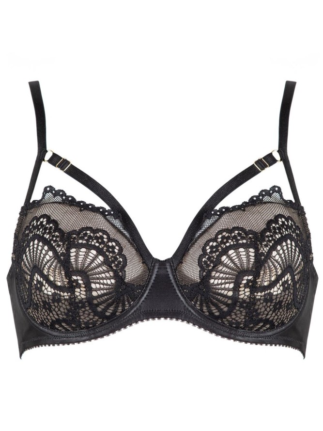 Gustowny biustonosz dla kobiet. Fason na fiszbinach z jednym cięciem na wysokim mostku z pięknym motywie roślinnym w intensywnej czerwieni, wykończony uroczymi kokardkami. Ramiączka nieodpinane, regulowane, tył zapinany na haftki. Wykonanie jak i...