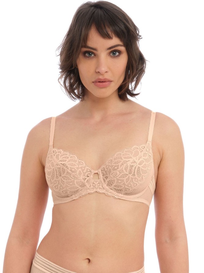 Miękki biustonosz na fiszbinach przeznaczony na średnie oraz większe rozmiary biustu. Wykonany z elastycznej, włoskiej koronki przód misek, doskonale zbiera i unosi piersi. Biustonosz posiada regulowane ramiączka oraz zapinany na dwie haftki tył....