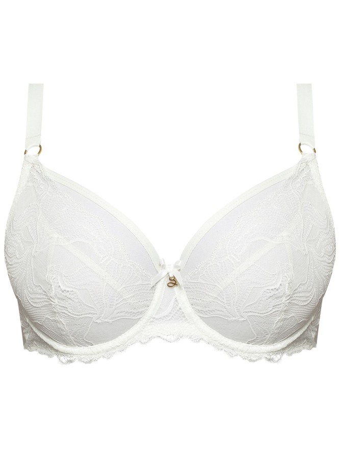 Uwodzicielski biustonosz typu soft z polskiej marki Samanta to coś co w swojej bieliźniarce powinna posiadać każda kobieta. Miękkie miseczki na fiszbinach wykonano z dwóch warstw tkaniny: spodnia to subtelny tiul, który otula z wierzchu oryginalnie zdobiona warstwa koronki. Całość w przepięknym śmietankowym kolorze. Odpowiednie cięcia modelowe doskonale zbierają biust do środka, tworząc tym samym wyjątkowo uwodzicielski dekolt. Odpinane z tyły, regulowane ramiączka posiadają możliwość krzyżowania ich na plecach, co pozwala na więcej możliwości stylistycznych. Tył biustonosza zapinany jest na haftki z możliwością regulacji obwodu. Niezwykle delikatny i stylowy przypadnie do gustu wielu z Nas.