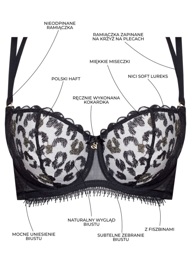 Elegancki biustonosz z kolekcji Zora A142 renomowanej marki Samanta, to prawdziwe dzieło sztuki bieliźnianej. Osadzone na fiszbinach, miękkie miski, dzięki pionowym cięciom doskonale unoszą i zbierają biust do środka, tworząc bardzo zmysłowy dekolt. Wykonany z delikatnego tiulu przód zdobią czarno - złote motywy pantery, którym pazura dodaje gipiurowa taśma, w postaci fikuśnych frędzli. Aksamitny obwód posiada domieszkę elastanu, dzięki czemu idealnie dopasowuje się do ciała. Biustonosz posiada regulowane podwójne ramiączka (z możliwością krzyżowania na plecach) oraz klasycznie gładki, zapinany na haftki tył.