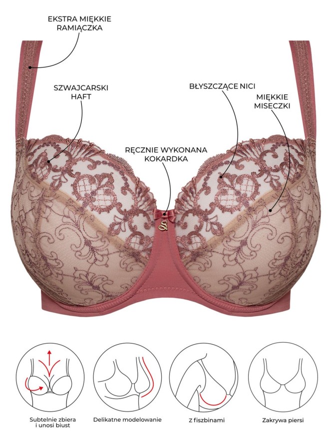Biustonosz wykonany jest z najwyższej jakości materiałów, co zapewnia delikatność i trwałość. Miękkie miseczki idealnie dopasowują się do kształtu biustu, oferując niezrównane wsparcie i podkreślając naturalne piękno. Ramiączka o regulowanej długości pozwalają na spersonalizowanie dopasowania, zapewniając wygodę przez cały dzień. Konstrukcja gwarantuje stabilność, co czyni go idealnym na każdą okazję.