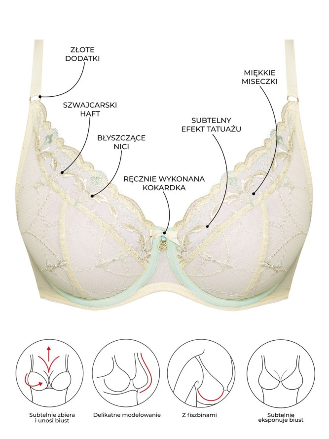 Samanta Laura A125 to miękki biustonosz, zaprojektowany z myślą o podkreśleniu naturalnego kształtu biustu i zapewnieniu wyjątkowego komfortu. Idealny dla kobiet poszukujących bielizny łączącej subtelną elegancję z funkcjonalnością na co dzień. Miękka konstrukcja z fiszbinami, która delikatnie unosi i eksponuje biust. Dzięki stabilnemu materiałowi miseczki zapewniają optymalne podtrzymanie nawet przy średnich i większych rozmiarach. Miseczki wykonane z ozdobnego, haftowanego tiulu w motywach kwiatowych, nadają bieliźnie lekkości i kobiecego uroku. Ramiączka regulowane, nieodpinane, z eleganckimi złotymi detalami. Zapewniają idealne dopasowanie do sylwetki i komfort przez cały dzień. Zdobienia w postaci subtelnych haftów i kokardki nadają całości szyku. Obwód wykonany z elastycznego materiału, który nie rozciąga się nadmiernie, co gwarantuje trwałość i wygodę noszenia.