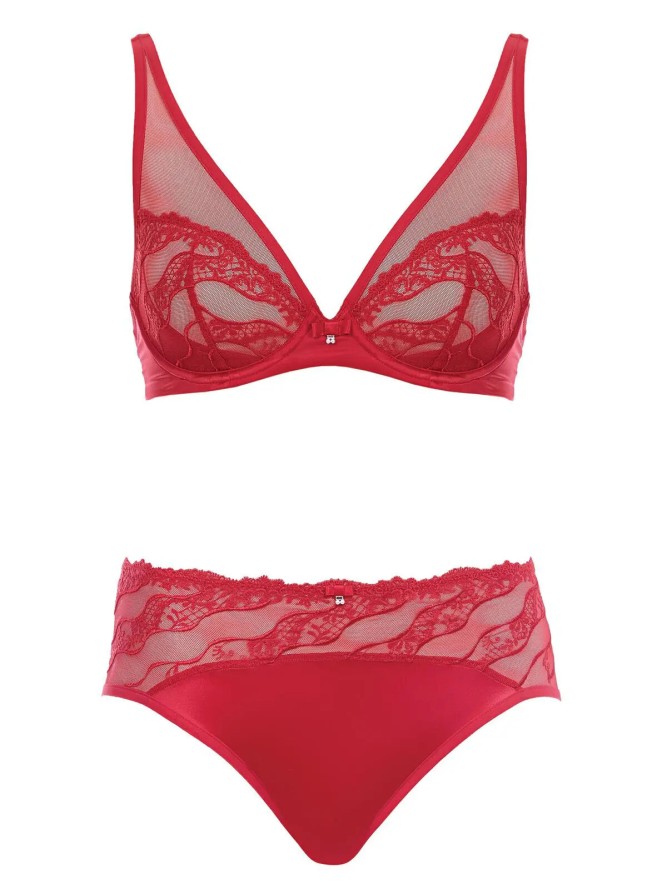 Eclat to biustonosz damski zaprojektowany przez renomowaną markę Wacoal. Ten ognisto czerwony biustonosz jest niezwykle zmysłowy a zarazem funkcjonalny. Miękkie, trójkątne miseczki na fiszbinie zostały wykonane z wysokiej jakości tiulu, którego ozdobiono oryginalnym, dekoracyjnym haftem. Nadaje to konstrukcji wyjątkowej delikatności i subtelności. Charakterystyczny kształt misek o pionowym cięciu rewelacyjnie zbiera i znakomicie podtrzymuje biust, zapewniając maksimum komfortu podczas użytkowania. Idealne dopasowanie zapewniają w pełni regulowane ramiączka oraz gładki, satynowy tył posiadający dwurzędowe, trzystopniowe zapięcie. Zaprojektowany z myślą o kobietach, które cenią sobie zmysłowy, efektowny look.