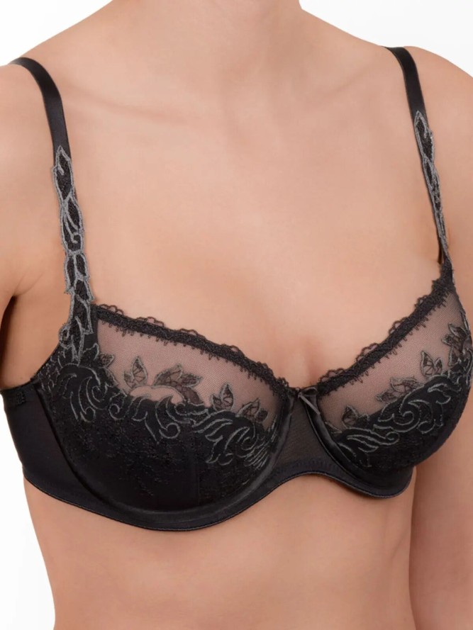 Bardzo urokliwy i niezwykle komfortowy biustonosz dedykowany kobietą ceniącym sobie zarówno wygodę jak i niebanalny wygląd. Model do połowy usztywniany, wykonany został z miękkiej, połyskującej tkaniny ozdobionej dodatkowo kropkami, góra miseczek...