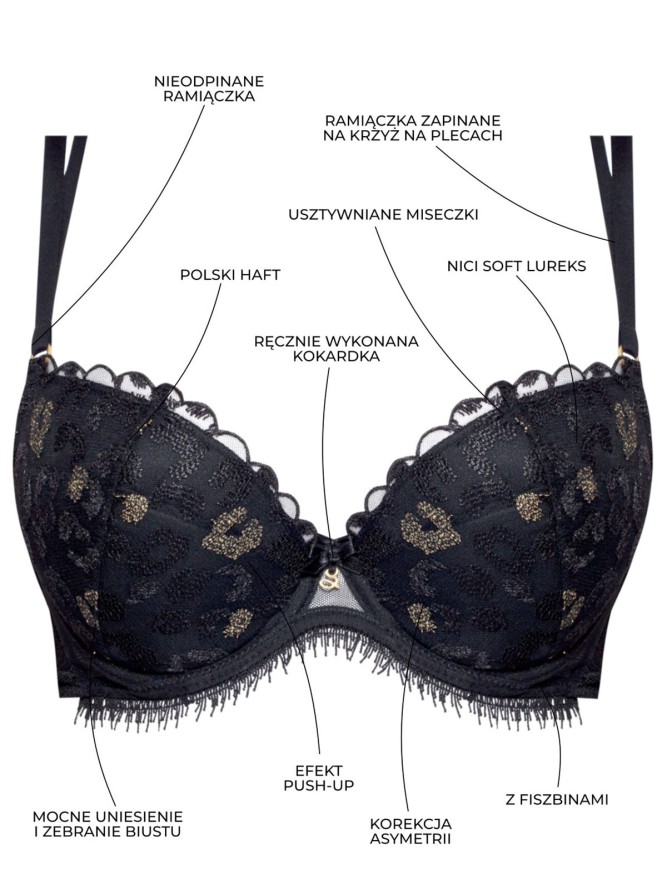 Czarny biustonosz z kolekcji Zora A332, to idealny model zarówno dla mniejszych, jak i średniej wielkości piersi. Doskonale zbiera i unosi biust. Przód misek pokrywa subtelnie zdobiony motywem pantery tiul, którego drapieżność podkreślono gipiurową taśmą w postaci fikuśnych frędzli. Aksamitny obwód posiada domieszkę elastanu, dzięki czemu idealnie dopasowuje się do ciała. Biustonosz posiada wewnętrzne kieszonki na wkładki push-up, które nie tylko powiększają, ale także pozwalają na ewentualną korektę asymetrii. Na szczególną uwagę zasługują podwójne, regulowane ramiączka, które możemy zalotnie krzyżować na plecach. Zora A332, to idealny model na co dzień lub wieczorne wyjścia.