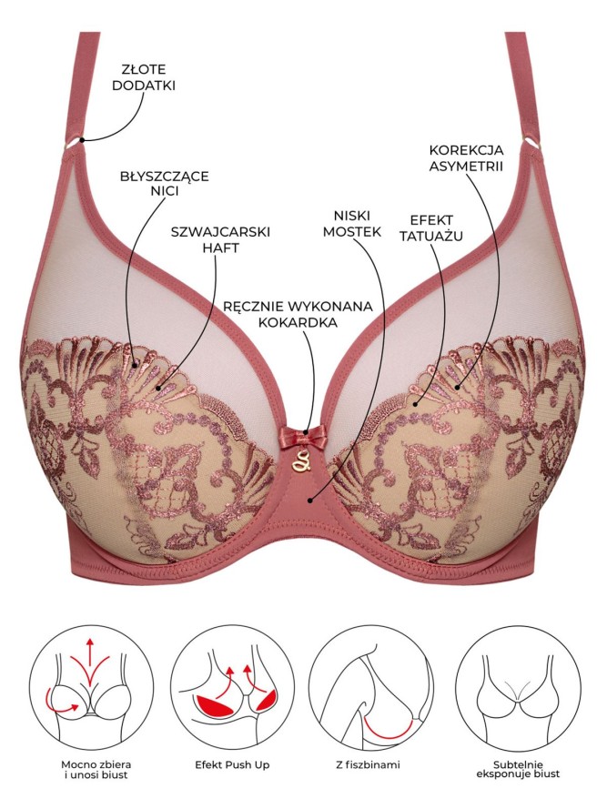 Biustonosz Samanta Perla A338 to doskonały wybór dla kobiet szukających komfortu i elegancji. Ten model, w kolorze ceglastym, idealnie wpisuje się w najnowsze trendy modowe, łącząc odważną barwę z klasycznym fasonem. Konstrukcja biustonosza typu push-up zapewnia wymarzone uniesienie i modelowanie biustu, co dodaje pewności siebie każdej kobiecie. Miseczki biustonosza zostały zaprojektowane z myślą o doskonałym dopasowaniu do kształtu piersi, a delikatnie podszyte wykończenie gwarantuje komfort przez cały dzień.