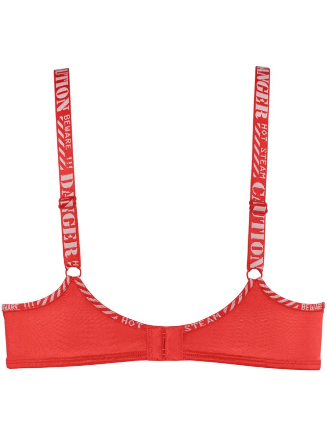 Wyjątkowy i niepowtarzalny biustonosz wykonany z wysokiej jakości materiału w czerwonym kolorze, to wspaniały kąsek dla koneserek ekstrawaganckiej bielizny. Odpowiednio wyprofilowane, gładkie miseczki z konstrukcją typu push-up, doskonale zbiorą i wymodelują biust. Przód udekorowany w gustowne połączone z regulowanymi ramiączkami paski, nie tylko pięknie podkreśli kształt piersi, ale może być też, ciekawym wykończeniem wielu stylizacji. Dodatkowym atutem modelu są ciekawe pisemne przesłania w języku angielskim "Beware, hot steam" to znaczy "Strzeż się, gorąca para", które umieszczono na regulowanych ramiączkach oraz brzegach materiału. Tył zapinany na dwie haftki