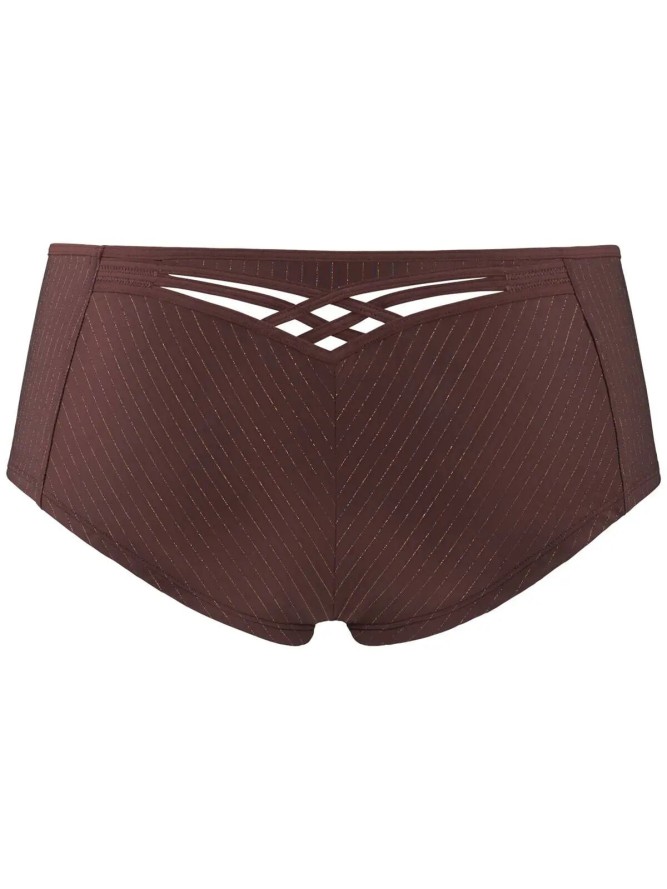 To efektowne szorty z kolekcji Dame de Paris. Wykonane zostały w całości z gładkiego, jednolitego materiału o barwie czekoladowego brązu, finezyjnie poprzeplatanej złotą nitką. Miękka, przyjemna tkanina zapewnia skórze możliwość swobodnego oddychania. Mają bardziej zabudowany krój niż klasyczne figi. Łączą wygodę z nienaganną prezencją. Szersze nogawki idealnie przylegają do kształtu kobiecego ciała. Zakrywają pośladki, znakomicie przy tym podkreślając ich owalny kształt. Tył ozdobiony przeplatającymi się paskami. Dla lepszego komfortu użytkowania krok wykończony został bawełną. Zaprojektowane z myślą o kobietach, które cenią sobie wysoki komfort noszenia.