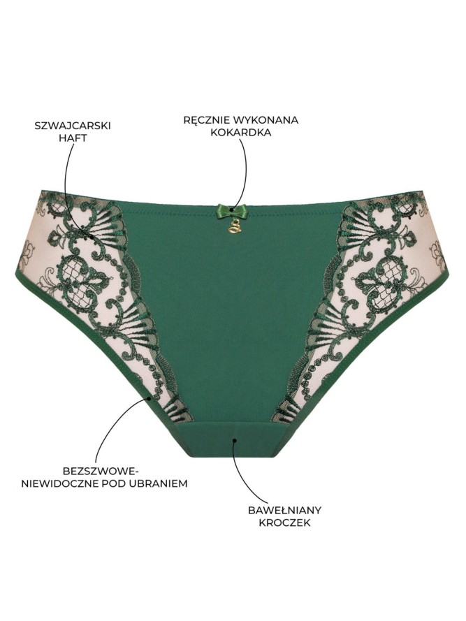 Figi brazyliany Samanta Perla M300 w kolorze zielonym to idealne połączenie elegancji i komfortu, które z pewnością zadowoli nawet najbardziej wymagające klientki. Przyciągają wzrok swoją subtelną konstrukcją, która podkreśla atuty sylwetki, jednocześnie zapewniając wygodę noszenia przez cały dzień. Figi brazyliany charakteryzują się średnim stanem oraz unikalnym krojem, który pięknie modeluje pośladki, dając uczucie lekkości i świeżości.