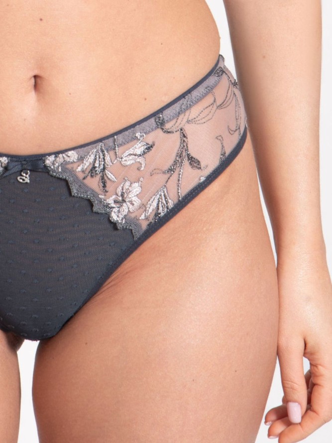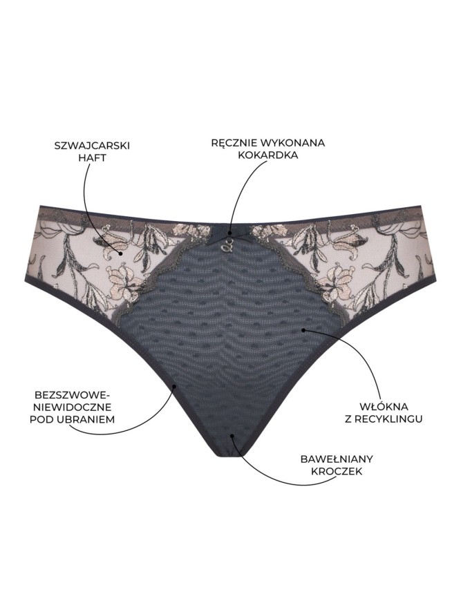 Majtki typu brazyliany to idealne połączenie zmysłowości i praktyczności. Dzięki wysokości i krojowi doskonale modelują linie bioder, zapewniając jednocześnie pełną swobodę ruchów. Grafitowy kolor dodaje klasycznego uroku, który pasuje do każdej okazji, od codziennego noszenia po wyjątkowe wyjścia.