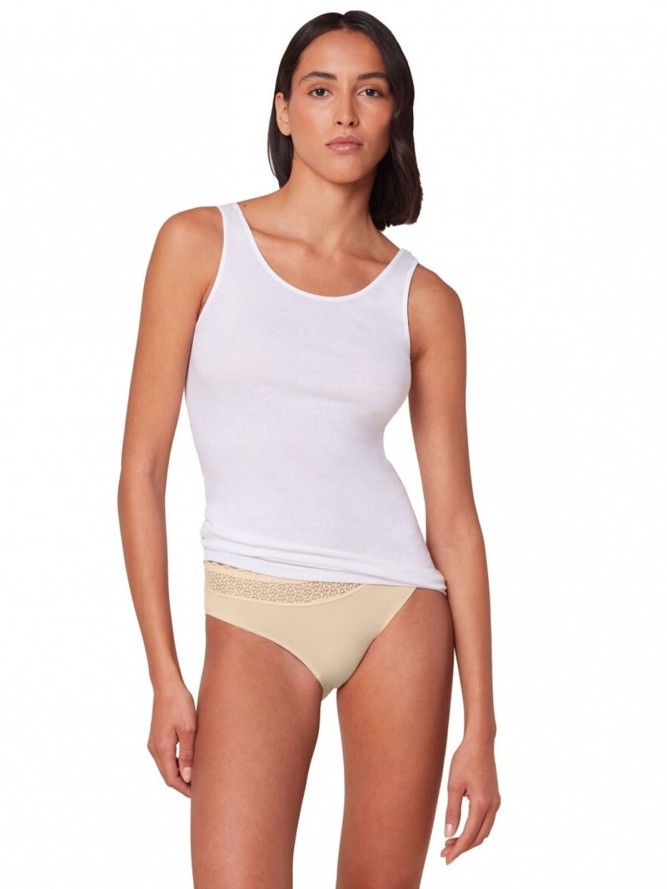 Model Tai charakteryzuje się klasycznym krojem, który subtelnie podkreśla linię bioder i talię, a zarazem oferuje pełne krycie. Wysokość w pasie zapewnia optymalne dopasowanie i komfort noszenia przez cały dzień, niezależnie od aktywności. Kolor beżowy to uniwersalny wybór, który dyskretnie wpasuje się pod jasne ubrania, gwarantując niewidoczność bielizny.