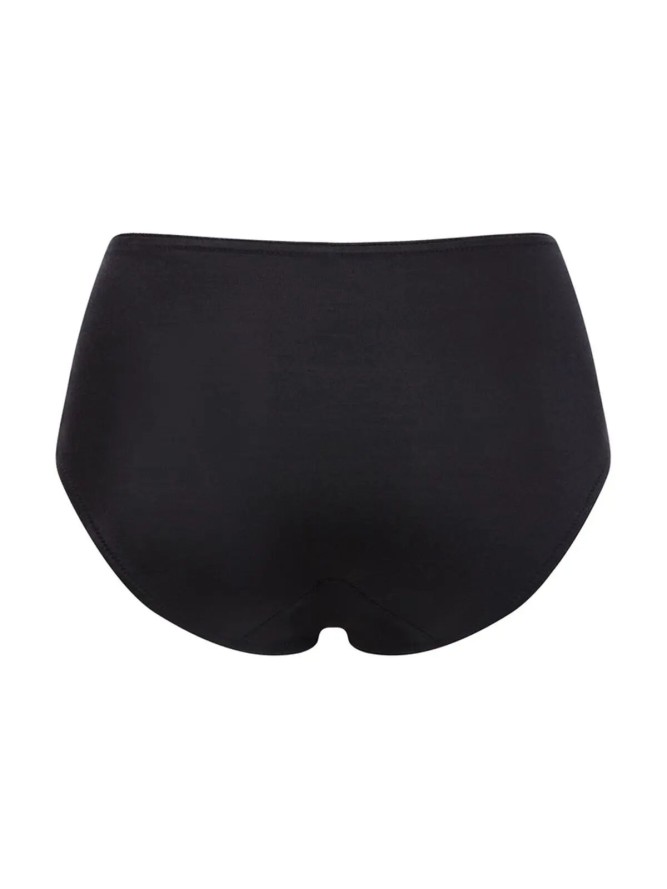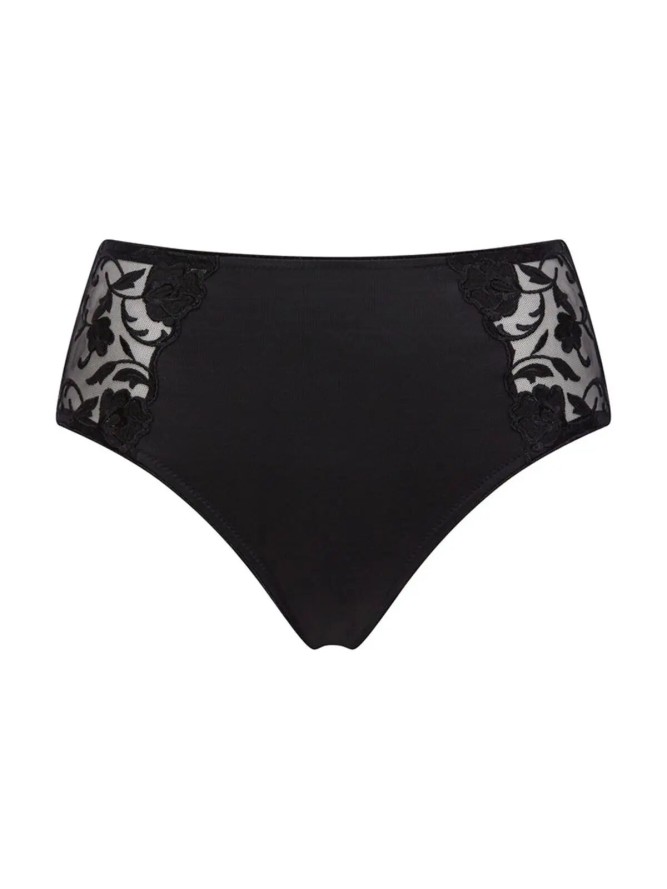 Wyższe figi w kolorze czarnym wykonane z wysokiej jakości tkaniny. Wykończone subtelnym haftem, który dodaje uroku i wdzięku. Bielizna idealnie dopasowuje się do ciała. Podkreśla naturalne, kobiece kształty.
