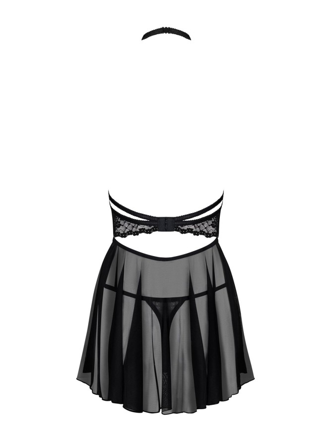 Kusząca subtelna koszulka. Wykonana ze zmysłowej prześwitującej siateczki połączonej koronką o motywie kwiatowym. Model z seksownie odkrytymi plecami i prześwitującą siateczką na pośladkach. Miseczki oraz przód koszulki uszyto z uroczej koronki...