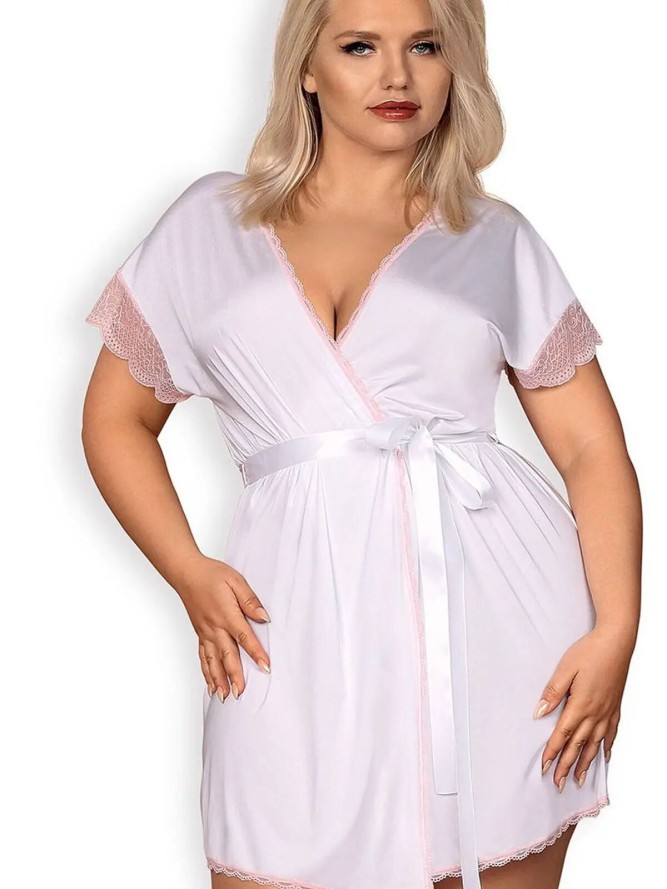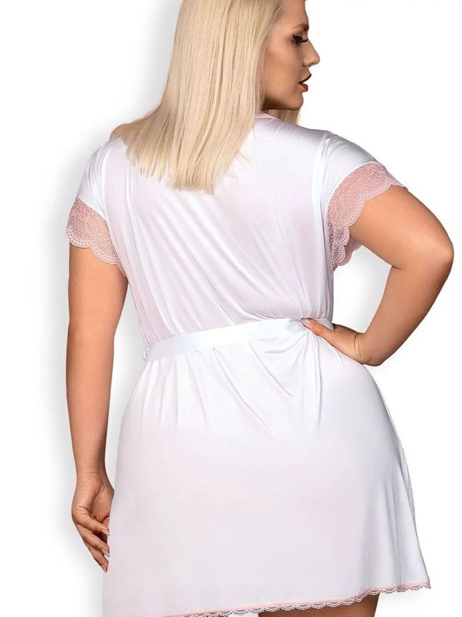 Delikatny damski szlafrok. Krój luźny, o długości przed kolano przewiązany w tali taśmą. Rękawy krótkie poszerzane z efektowną koronką, nadającą uroczego i oryginalnego stylu. Tył w górnej części ozdobiony elementem w kształcie kokardy. Świetny...