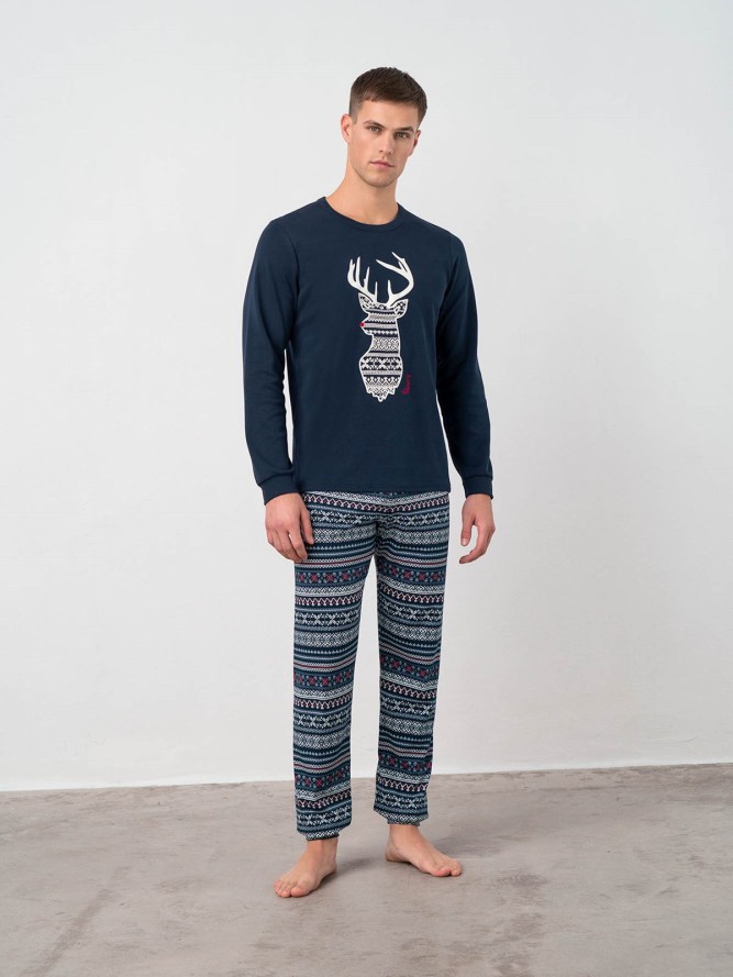 Ciepła piżama męska z długim rękawem w kolorze grafitowym. Bluza posiada jasny wzór na grafitowym tle. Wykończona górą w serek, rozpinany na cztery guziki. Rękawy i dół zakończony ściągaczem. Spodnie całe grafitowe na gumce, dołem również...