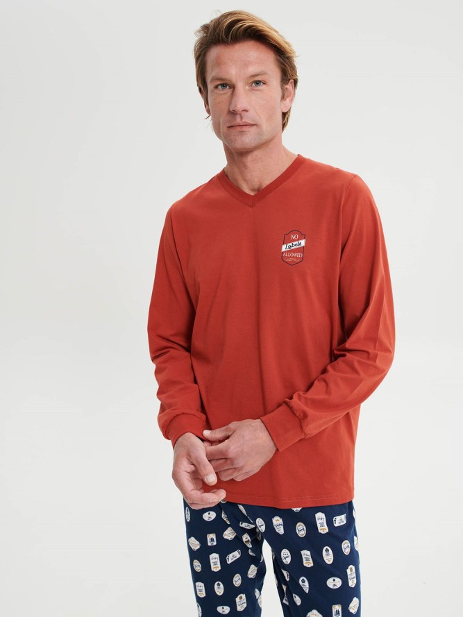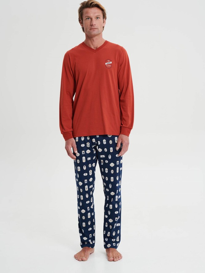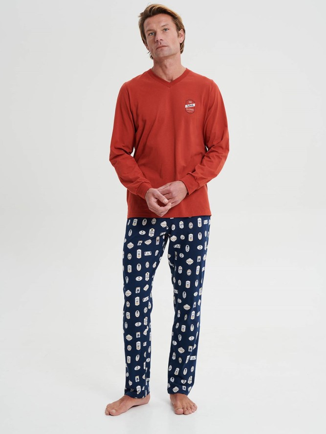 Wygodna, bawełniana piżama męska wykonana z wysoko gatunkowego materiału z długimi rękawami i spodniami. Bluza w kolorze granatowym, pod szyją wykończona w delikatny serek, rękawy zakończone ściągaczem. Na boku zdobna aplikacją. Spodnie granatowe...