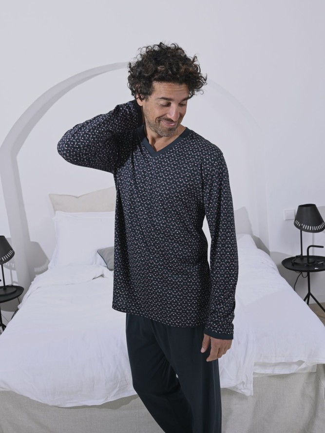 Piżama została wykonana z miękkiej i przyjemnej w dotyku tkaniny, która zapewnia pełen komfort podczas snu. Model ten charakteryzuje się klasyczną budową z dekoltem V, który dodaje elegancji. Rękawy o pełnej długości idealnie sprawdzają się w chłodniejsze dni i stanowią doskonały kompromis pomiędzy swobodą a ciepłem. Dół zestawu to długie spodnie, które doskonale komponują się z górną częścią.