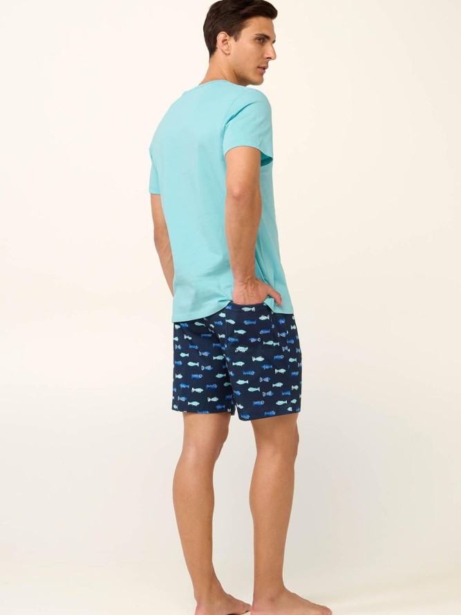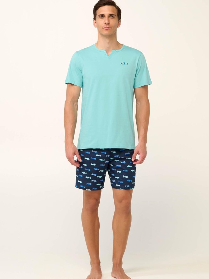 Ta piżama wyróżnia się dekoltem typu V, zapinanym na guziki, co dodaje jej klasycznego uroku. Krótki rękaw wraz z krótkimi nogawkami sprawiają, że jest to doskonały wybór na ciepłe wieczory i noce. Piżama jest dostępna w pięknym, niebieskim kolorze, który wprowadza świeżość i spokój do Twojej nocnej garderoby.