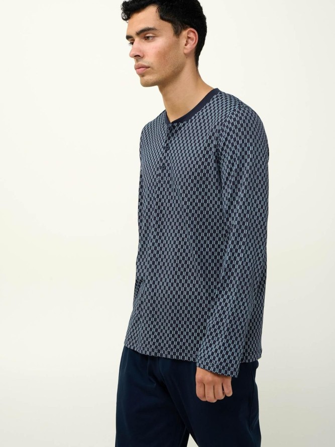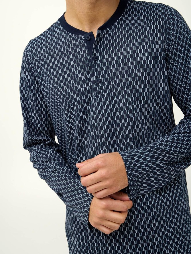Ten model piżamy charakteryzuje się okrągłym dekoltem, co zapewnia swobodę ruchów i dodatkowy komfort podczas snu. Fason dopasowany, ale nie ograniczający ruchów, sprawia, że piżama idealnie leży na sylwetce. Długie nogawki są idealne na chłodniejsze noce, zapewniając ciepło i przytulność.
