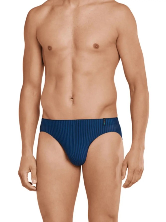 Eleganckie męskie slipy znanej i cenionej w świecie marki Schiesser wykonane z wysokiej jakości, delikatnej i przyjemnej w dotyku tkaniny w niebieskim kolorze w pionowe prążki. Klasyczny, anatomiczny krój mocno przylegający do ciała i podkreślający atuty męskiej sylwetki od lat cieszy się niesłabnącą popularnością wśród mężczyzn. Sprawdzony fason, o umiarkowanym wykrojeniu, precyzyjnie wykończono płaskim szwem i elastyczną gumką w pasie, która zapewnia wygodę i idealne dopasowanie. Ten niewątpliwie praktyczny rodzaj bielizny zaprojektowano z myślą o mężczyznach, którzy cenią precyzję wykonania oraz wysokiej jakości komfort użytkowania