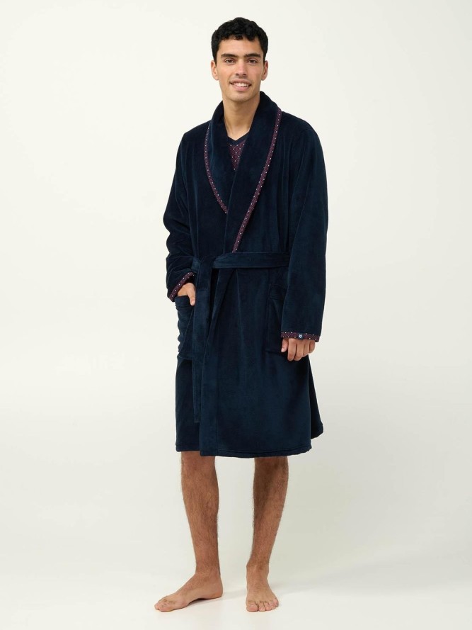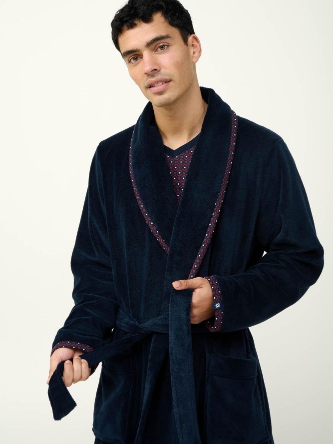 Ten męski szlafrok wyróżnia się klasycznym krojem z dekoltem w literę V, który dodaje mu szyku. Granatowy kolor podkreśla jego uniwersalny i elegancki charakter. Fason został dopasowany do potrzeb współczesnych mężczyzn, a długość całkowita zapewnia idealne okrycie.