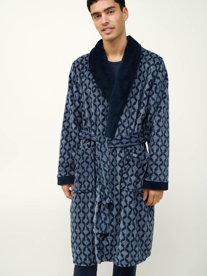 Długość szlafroka została dostosowana do sylwetki, oferując optymalną ochronę i komfort, nie ograniczając jednocześnie swobody ruchów. Motyw geometryczny w szlafroku to prawdziwy hit sezonu, przyciągający uwagę i podkreślający unikalny gust właściciela.