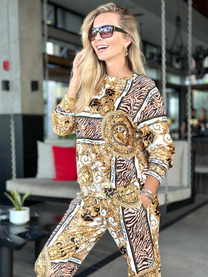 Wykonany z wysokiej jakości materiałów, dres charakteryzuje się elastycznością i przewiewnością, zapewniając komfort noszenia przez cały dzień. Górna część dresu olśniewa trendowym dekoltem typu hiszpanka, który dodaje wdzięku i kobiecego uroku. Długie nogawki, idealnie skrojone, dodają elegancji i pozwalają poczuć się pewnie w każdej sytuacji.