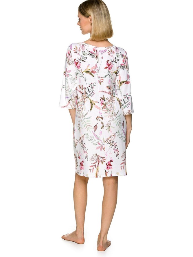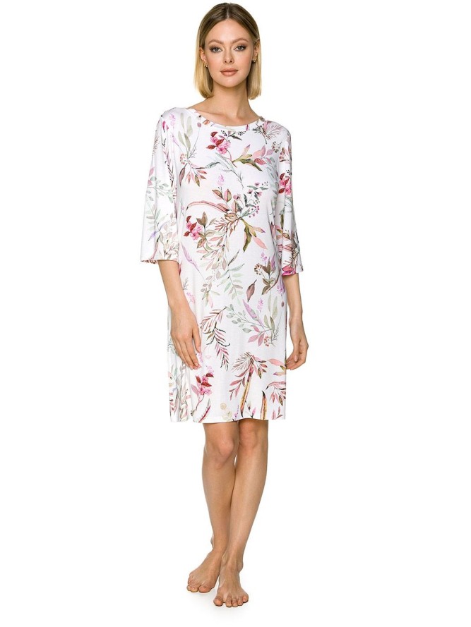 Damska koszulka nocna, klasyczny, prosty krój, delikatnie na dole poszerzana. Na bladożółtym tle pokazany został motyw liści (monstery). Wykończenie mankietów i dolnej lamówki jest gładki. Koszula wygląda lekko i swobodnie. 100% bawełna zapewnia...