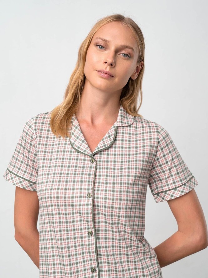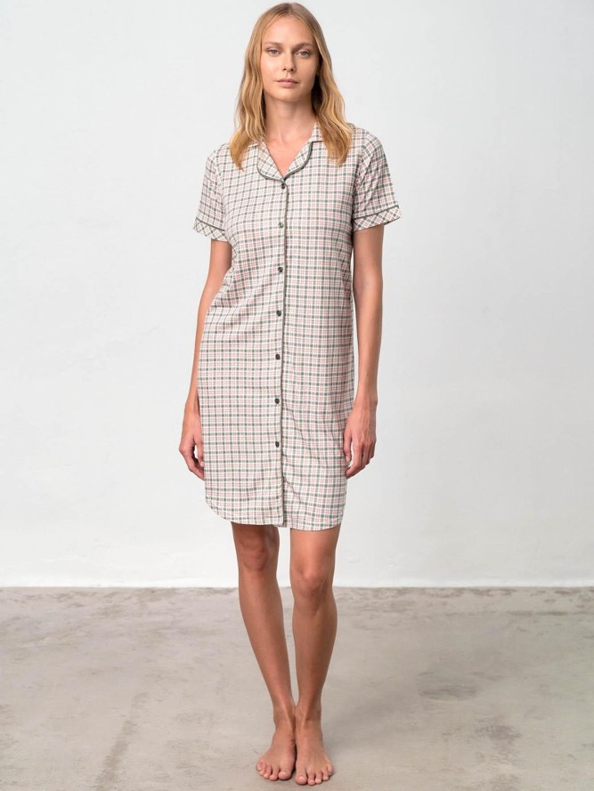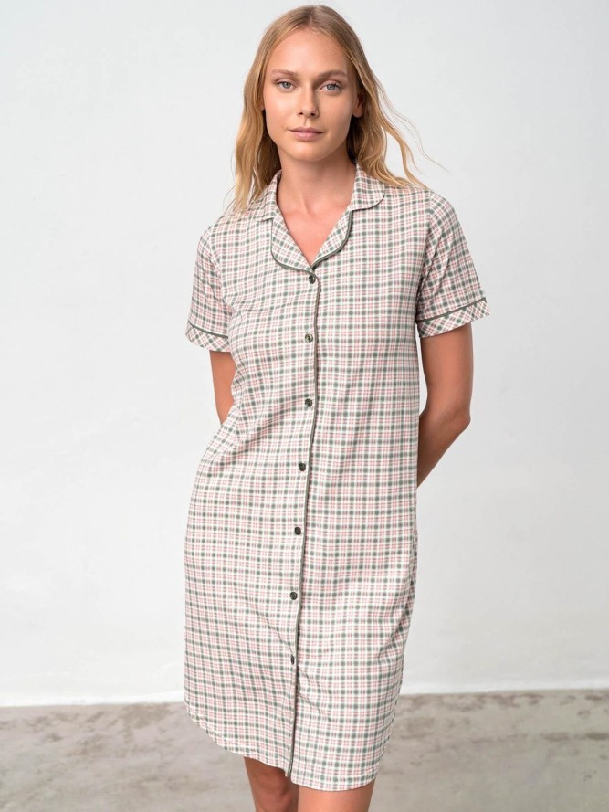 Elegancka beżowa koszulka nocna. Model prosty rozpinany na całej długości na guziczki. Rękawki długie zakończone białym mankietem. Koszulka z kołnierzykiem i ozdobną kieszonką czyni ten model wyjątkowo luksusowym. Idealne połączenie tkanin,...