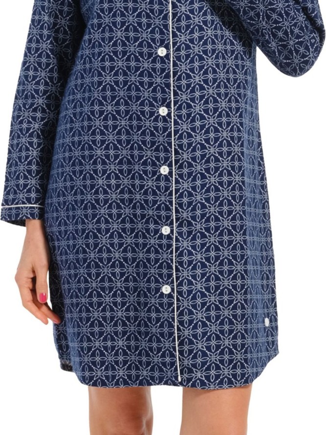 Damska koszulka nocna z długim rękawem, wzór nieco orientalny, trochę kwiatowy. Małe guziczki biegnące od dekoltu podkreślają charakter tej koszulki i dodają jej uroku. Tonacja raczej ciemniejsza czerń, granat. Wykonana z bawełny i modalu. 50%...