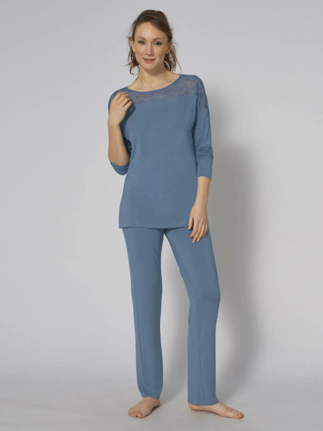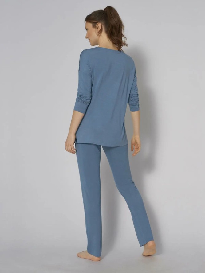 Urocza piżama dla pań w kolorze kremowym firmy Coemi. Górna część o luźnym kroju z długim rękawem z okrągłym dekoltem oraz subtelnym wycięciem w postaci łezki. Tył zdobiony piękną, wyrazistą koronką, która nadaje gustownego i oryginalnego...