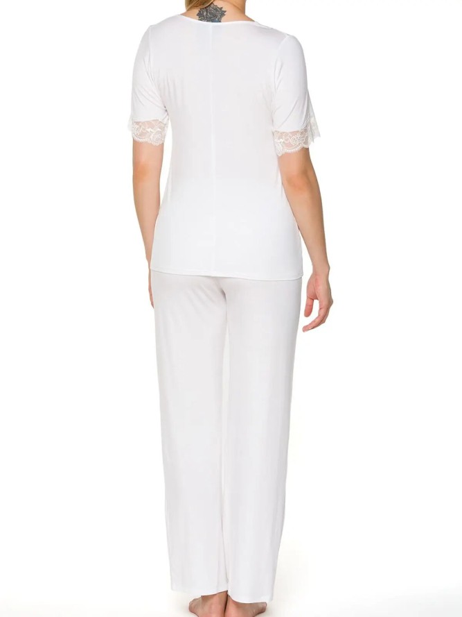 Jej krótki rękaw oraz klasyczny krój zapewniają swobodę ruchu i komfort termiczny przez całą noc. Luźny fason piżamy sprawia, że dopasowanie jest idealne dla każdej sylwetki. Długość nogawki jest optymalnie dobrana, aby zapewniać wygodę podczas snu. Dekolt w kształcie litry V podkreśla delikatność kobiecego karku i zapewnia dodatkowy komfort bez krępowania ruchów.