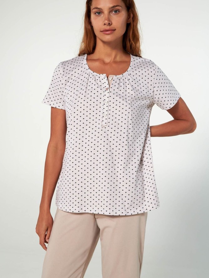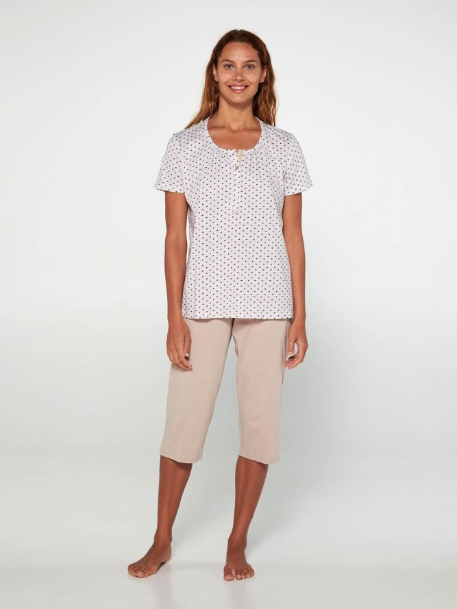 Piżama damska VAMP 20371 to doskonały wybór dla kobiet, które cenią sobie komfort i elegancję podczas snu.Wykonana z najwyższej jakości materiałów, gwarantuje przyjemne użytkowanie i subtelny, beżowy odcień, który z łatwością dopasuje się do każdego gustu. Jej klasyczny krój z krótkim rękawem oraz dekoltem pół okrągłym sprawia, że jest nie tylko praktyczna, ale i stylowa. Długość nogawek za kolano zapewnia swobodę ruchu, idealną na cieplejsze noce. Dzięki swojemu ponadczasowemu designowi, piżama VAMP 20371 to nieodłączny element garderoby każdej kobiety ceniącej wygodę i modny wygląd. W kategorii piżama damska, ten model wyróżnia się starannością wykonania i unikatowym stylem odpowiednim dla nowoczesnych kobiet. Szukając piżam idealnych do snu, użytkowniczki zwracają uwagę na detale takie jak materiał, fason oraz kolor, a ten model spełnia wszystkie te oczekiwania, gwarantując satysfakcję z zakupu.