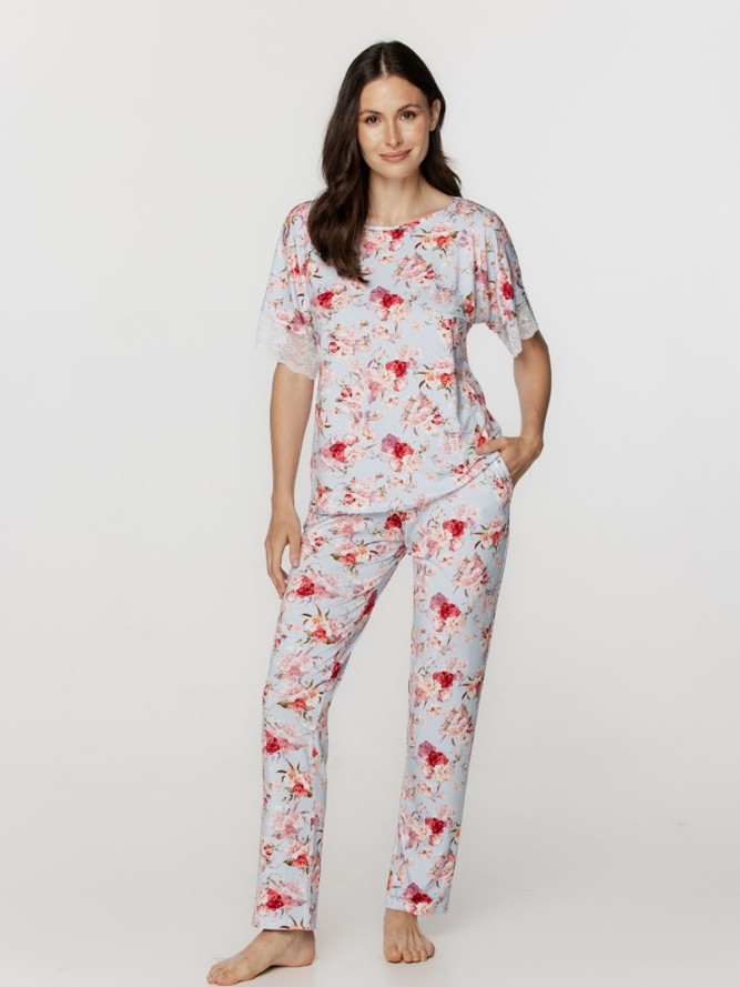 Model ten charakteryzuje się okrągłym dekoltem, który jest nie tylko elegancki, ale także niezwykle wygodny. Fason piżamy jest klasyczny, z długimi nogawkami, co dodatkowo podkreśla jej uniwersalność i praktyczność, idealną na każdą pogodę. Doskonała zarówno na chłodniejsze wieczory, jak i poranki.