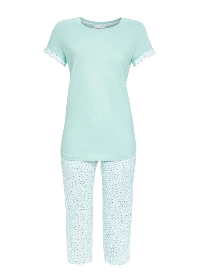 Piżama posiada okrągły dekolt i krótki rękaw, co gwarantuje swobodę ruchów oraz przewiewność, szczególnie cenione w cieplejsze noce. Charakterystyczne 3 nogawki dodają całości elegancji i nowoczesnego wyglądu. Seledynowy kolor wprowadza odrobinę świeżości i spokoju, doskonale komponując się z modnymi dodatkami.