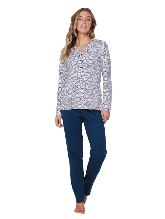 Głównym elementem tej piżamy jest dekolt w literę V, który podkreśla kobiecą sylwetkę, dodając jej elegancji. Piżama charakteryzuje się klasycznym fasonem z długimi nogawkami, co sprawia, że jest idealna na chłodniejsze noce. Wielokolorowy wzór dodaje świeżości i nowoczesności, sprawiając, że staje się ulubieńcem wśród modnych kobiet.