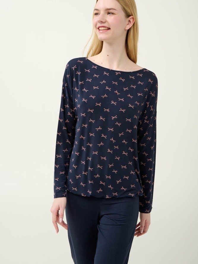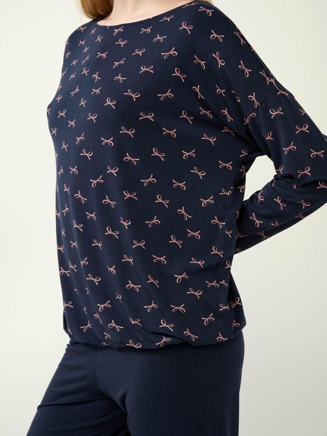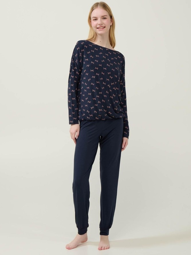 Piżama posiada klasyczny fason z okrągłym dekoltem, który delikatnie podkreśla kobiecą sylwetkę, zapewniając jednocześnie swobodę ruchów. Długie nogawki dodają jej przytulności, co czyni ją idealnym wyborem na chłodniejsze noce. Granatowy kolor, będący synonimem szyku i klasy, sprawia, że każda kobieta poczuje się wyjątkowo, niezależnie od pory roku.