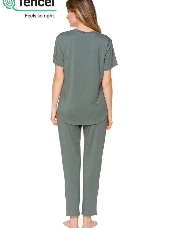 Damskie, piżamowe spodnie z nogawką o długości 3/4 w kolorze zielonym zakończone ściągaczem. Posiadają kieszenie boczne i elastyczną gumę z taśmą, które umożliwiają idealne dopasowanie ich do ciała. Doskonale sprawdzą się również jako strój...