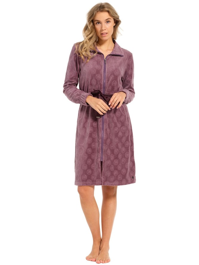 Szlafrok posiada klasyczny, długi fason, który delikatnie otula sylwetkę, dodając jej smukłości. Rodzaj dekoltu jest subtelny i kobiecy, co podkreśla jego uniwersalny charakter. Fioletowy kolor nadaje produktowi wyjątkowej elegancji, idealnej na relaksujące chwile spędzone w domowym zaciszu. Wyjątkowy design szlafroka Pastunette stanowi doskonały wybór dla wszystkich miłośniczek stylowej bielizny domowej.