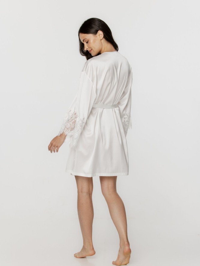 Szlafrok posiada dekolt szalowy, który dodaje mu elegancji, a rękaw 3/4 pozwala na swobodę ruchów, zapewniając jednocześnie odpowiednią ilość ciepła w chłodniejsze dni. Długość sięgająca do kolan sprawia, że jest to idealny wybór zarówno na letnie poranki, jak i zimowe wieczory.