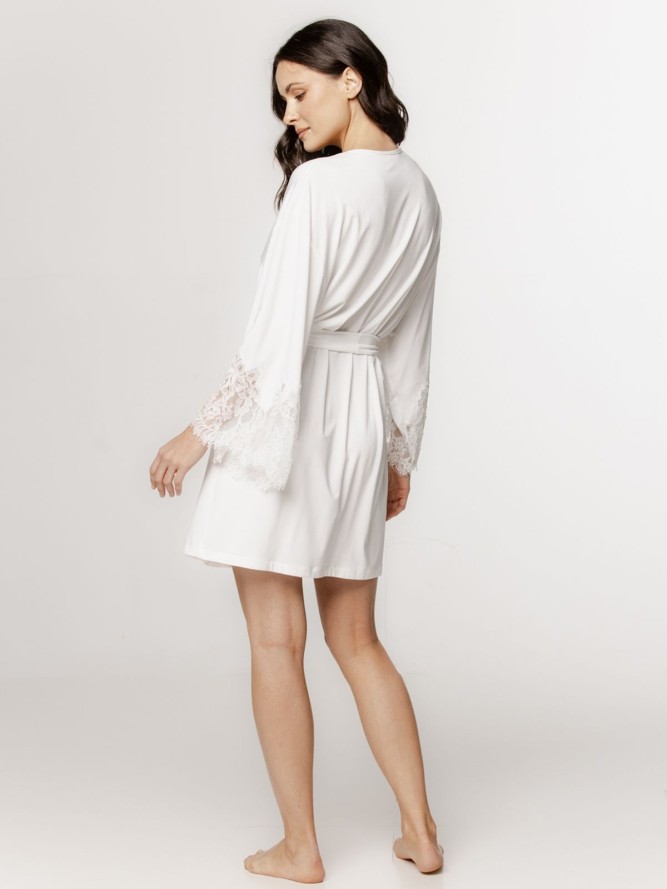 Szlafrok wyróżnia się przemyślaną budową, która zapewnia doskonałe dopasowanie do sylwetki. Dekolt w literę V podkreśla kobiecość, a krój zapewnia swobodę ruchów. Długość sięgająca do kolan sprawia, że jest to idealny wybór zarówno na chłodne, jak i cieplejsze dni. W kategorii damskich szlafroków kremowy kolor nadaje mu niezwykle elegancki charakter.