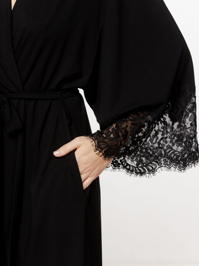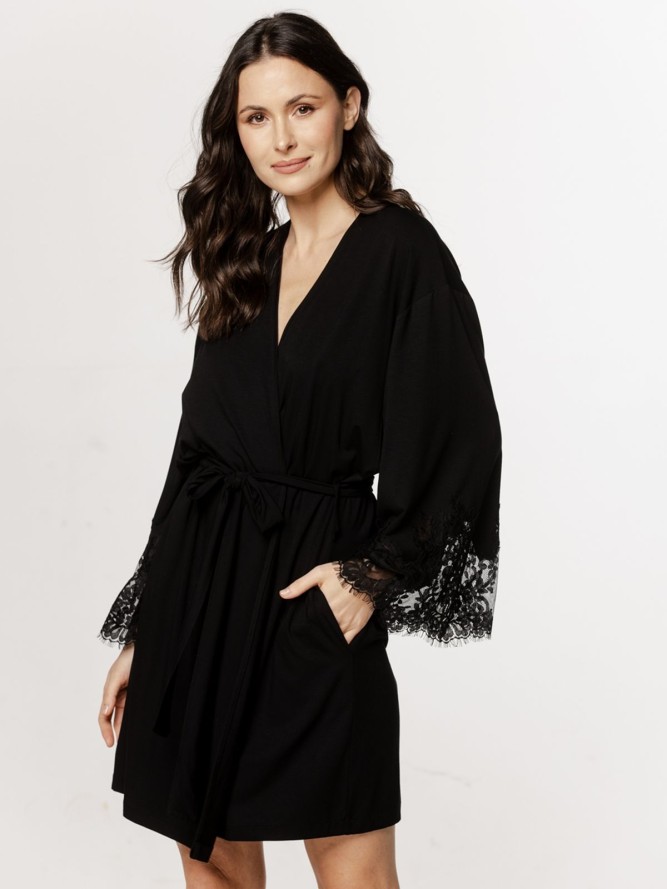 Szlafrok Coemi wyróżnia się dekoltem w literę V, który podkreśla kobiecą sylwetkę, dodając jednocześnie subtelnej elegancji. Model ten posiada krótki fason, idealny na ciepłe poranki i wieczory. Czarny kolor dodaje mu ponadczasowej klasyki, dzięki czemu jest nie tylko praktyczny, ale i stylowy.