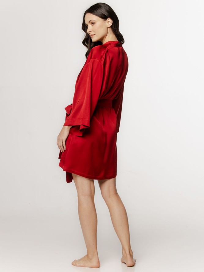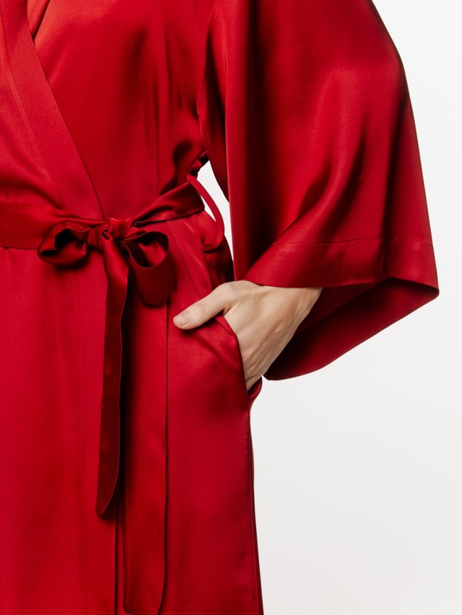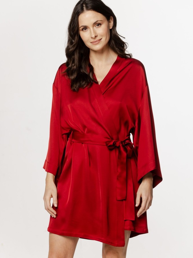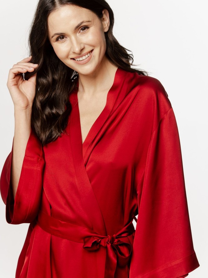 Szlafrok posiada dekolt w kształcie litery V, który podkreśla kobiecą sylwetkę, jednocześnie oferując komfort noszenia. Fason szlafroka jest klasyczny, co czyni go uniwersalnym dodatkiem do garderoby, który z łatwością dopasujesz do różnych stylizacji domowych. Dzięki długim nogawkom, model ten zapewnia dodatkowe ciepło w chłodniejsze dni.