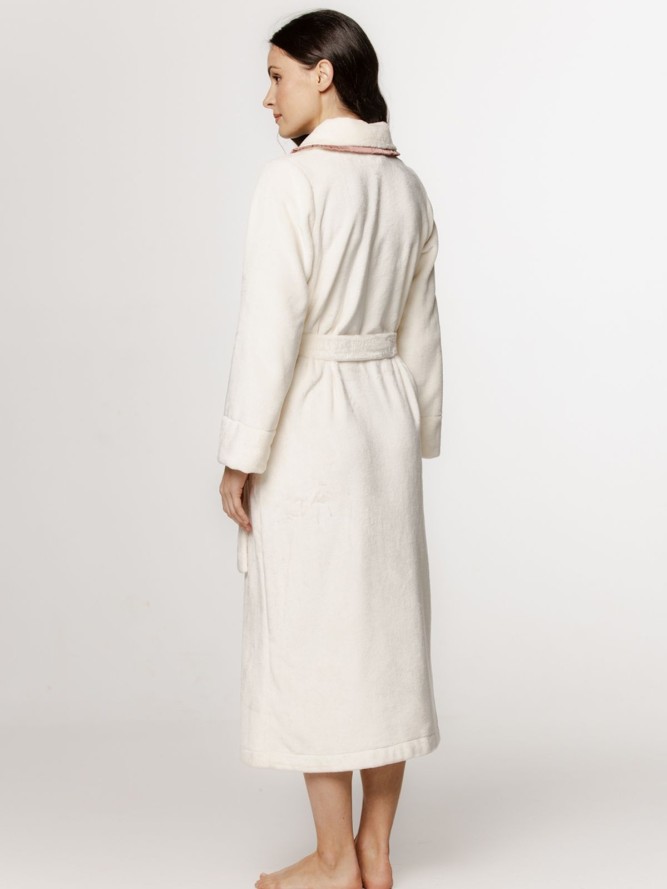 Model wyróżnia się dekoltem w literę V, który dodaje całości subtelności i podkreśla sylwetkę, tworząc zmysłowy efekt. Klasyczny fason szlafroka zapewnia pełną swobodę ruchów, co czyni go doskonałym wyborem zarówno na leniwe poranki, jak i relaksujące wieczory. Kremowy odcień szlafroka wprowadza nutę luksusu do codziennego odpoczynku, dodając odrobinę klasy każdej chwili wypoczynku.