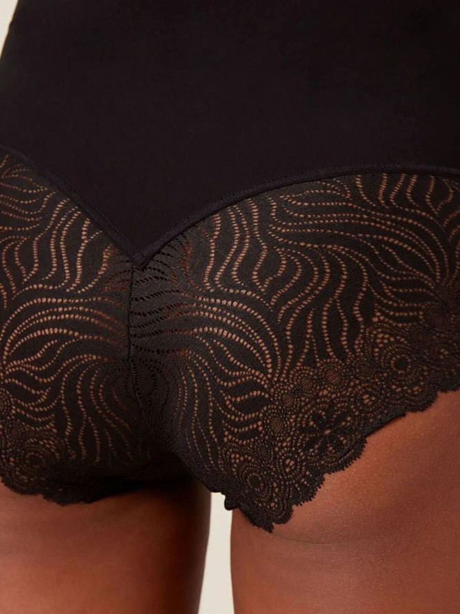 Beżowe figi modelujące o wyższym fasonie. Gwarantują wymodelowanie tali, brzucha i uniesienie pośladków. Materiał gładki w przodzie i na tyle, natomiast na pośladkach delikatna koronka, bez szwów która zapewnia nieodznaczanie się pod obcisłymi...